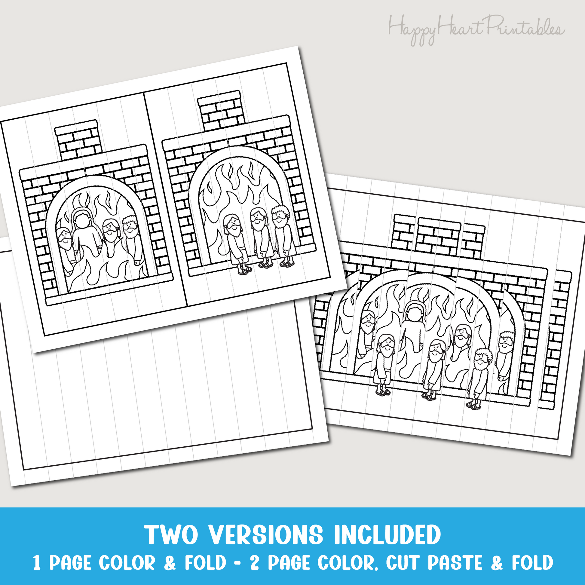 Shadrack, Meshach and Abednego in the fiery furnace printable Bible craft. Look at this agamograph or fan fold craft one way and see four men in the fire; then look at it the other way and see the three men out of the fire, unharmed. Choose which version would work best for you, then color and fold back and forth along gray lines. A fun craft from Daniel 3.