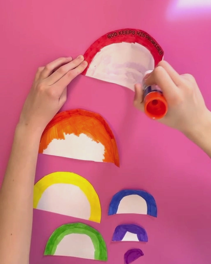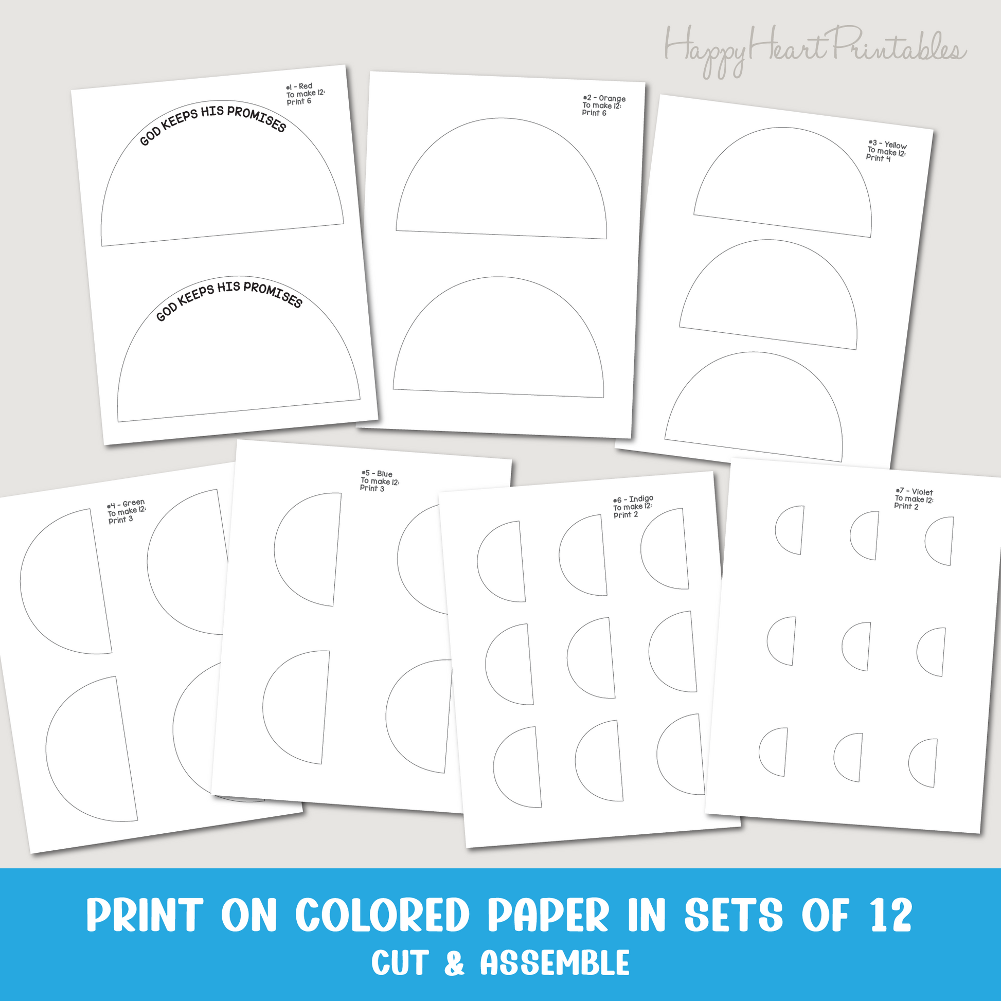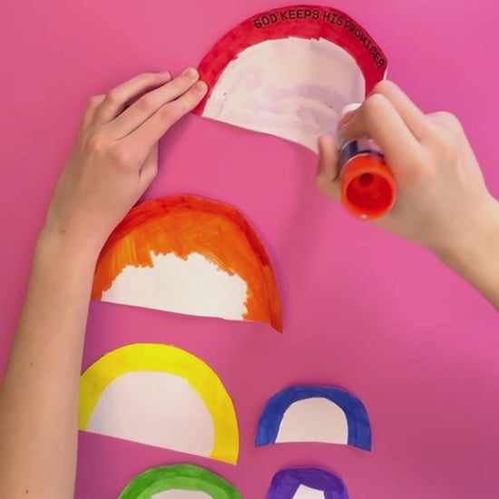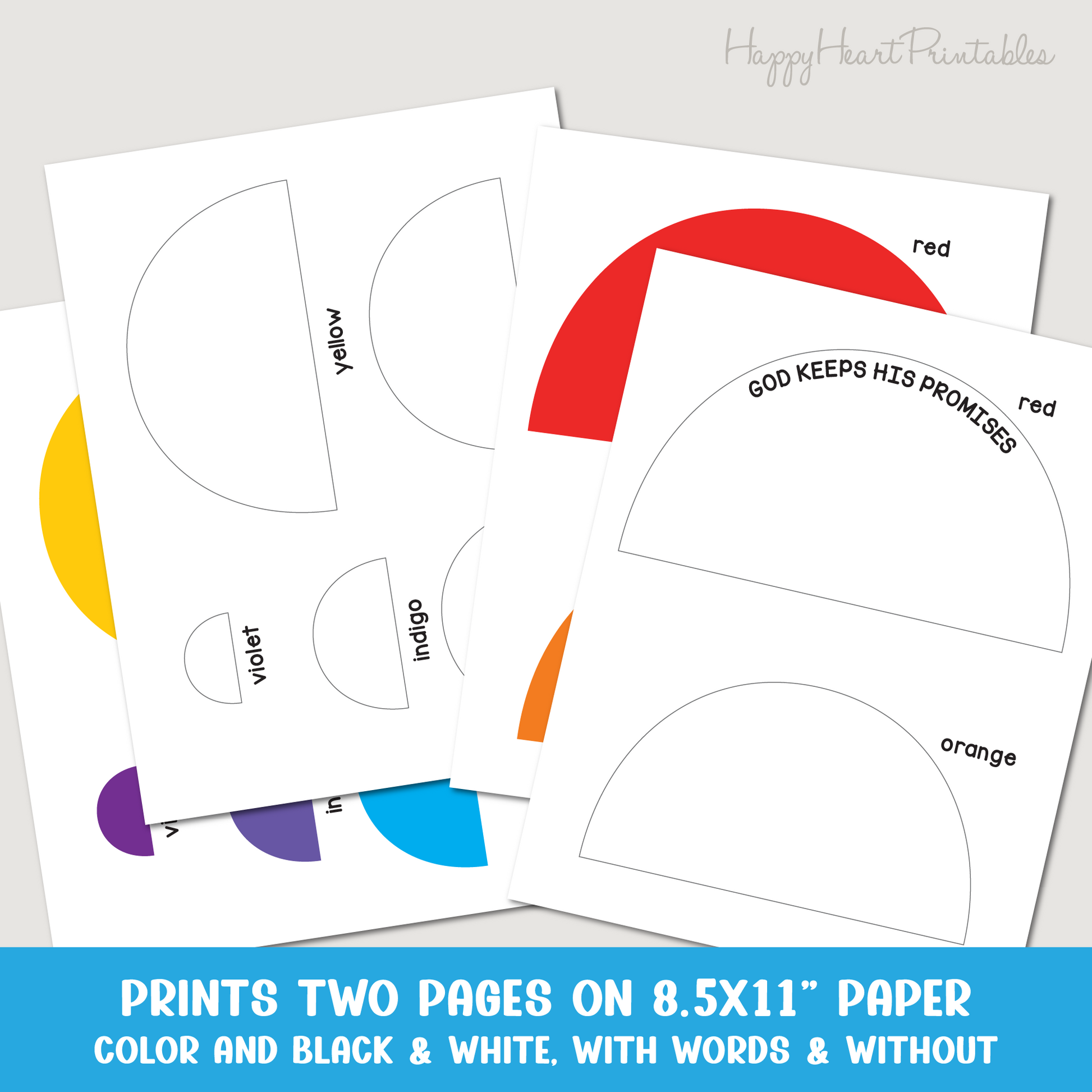 This printable rainbow craft reminds us like the rainbow after the flood that God keeps his promises. The story of Noah and the ark is from Genesis 7-9. A fun and easy Bible craft for kids! Stack the rainbow half circles and glue. Then punch a hole in the bottom of each stripe and attach coordinating colored yarn.