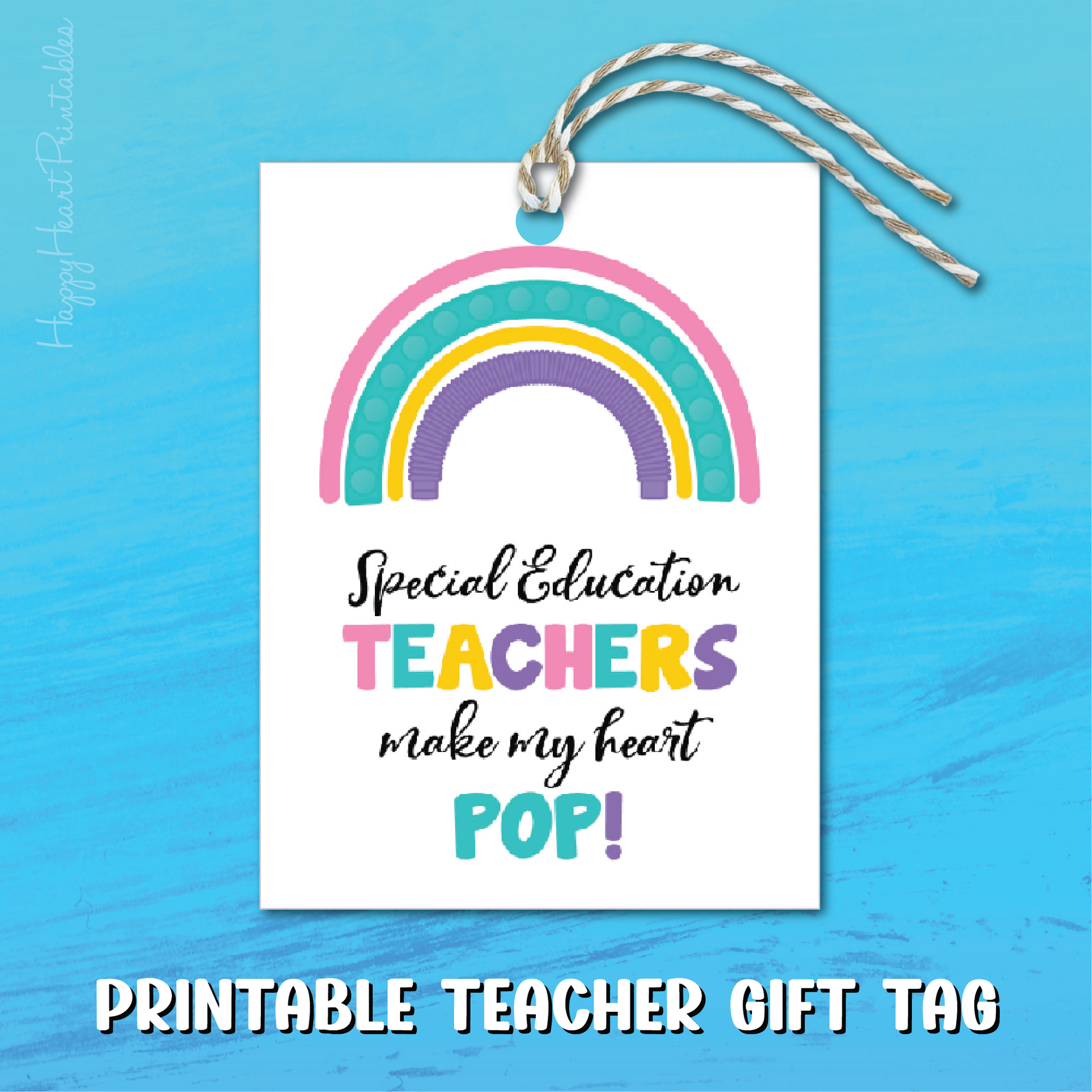 "Special Education Teachers Make My Heart Pop" teacher appreciation printable gift tag with pop tube and pop it rainbow. Attach to gift to special education teachers for teacher appreciation week or at the end of the year.