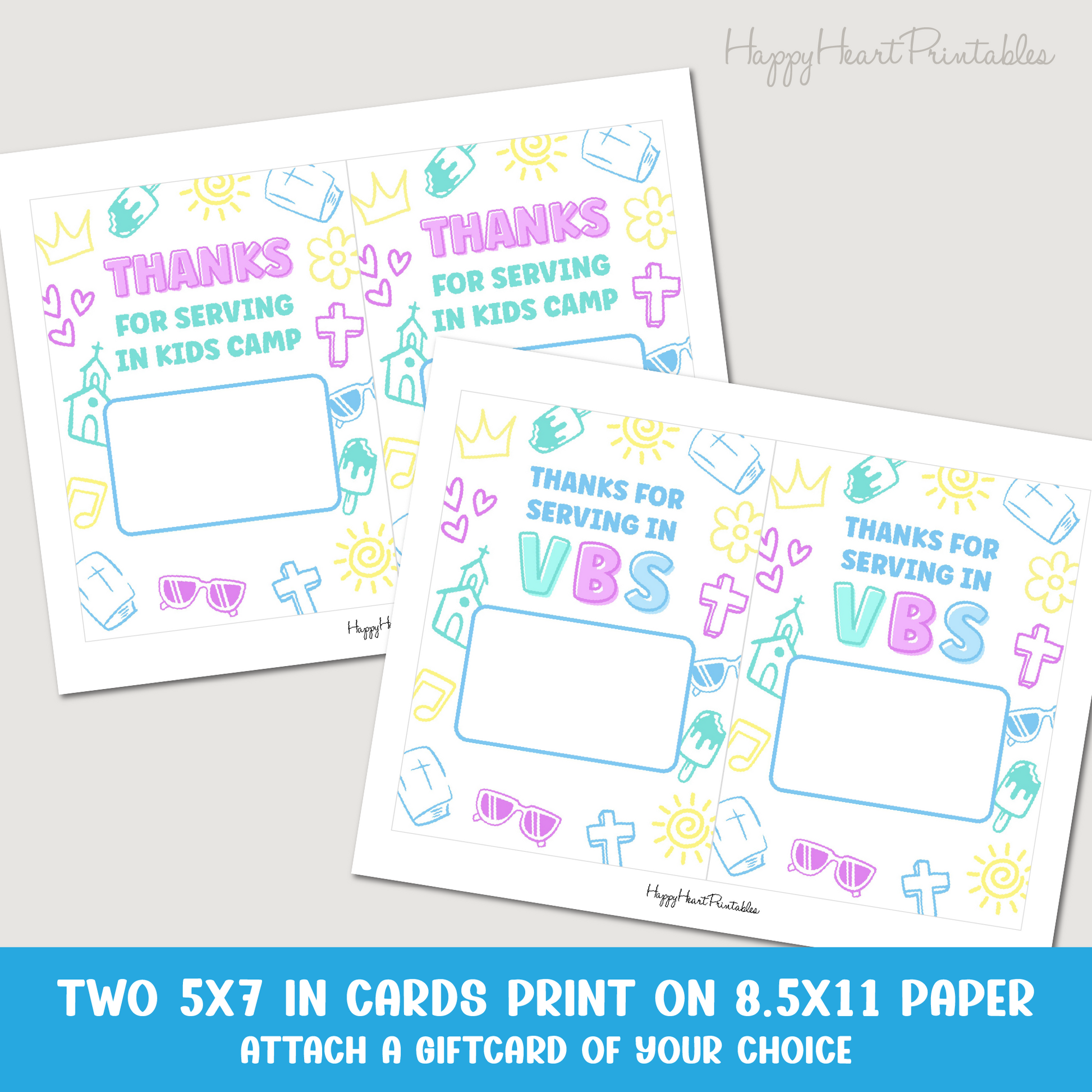 Thank you gift for VBS volunteers and teachers. These printable gift card holders make showing your appreciation easy. 2 versions included with: "VBS" and "Kids Camp." Cards are 5x7 inches and print 2 per page.